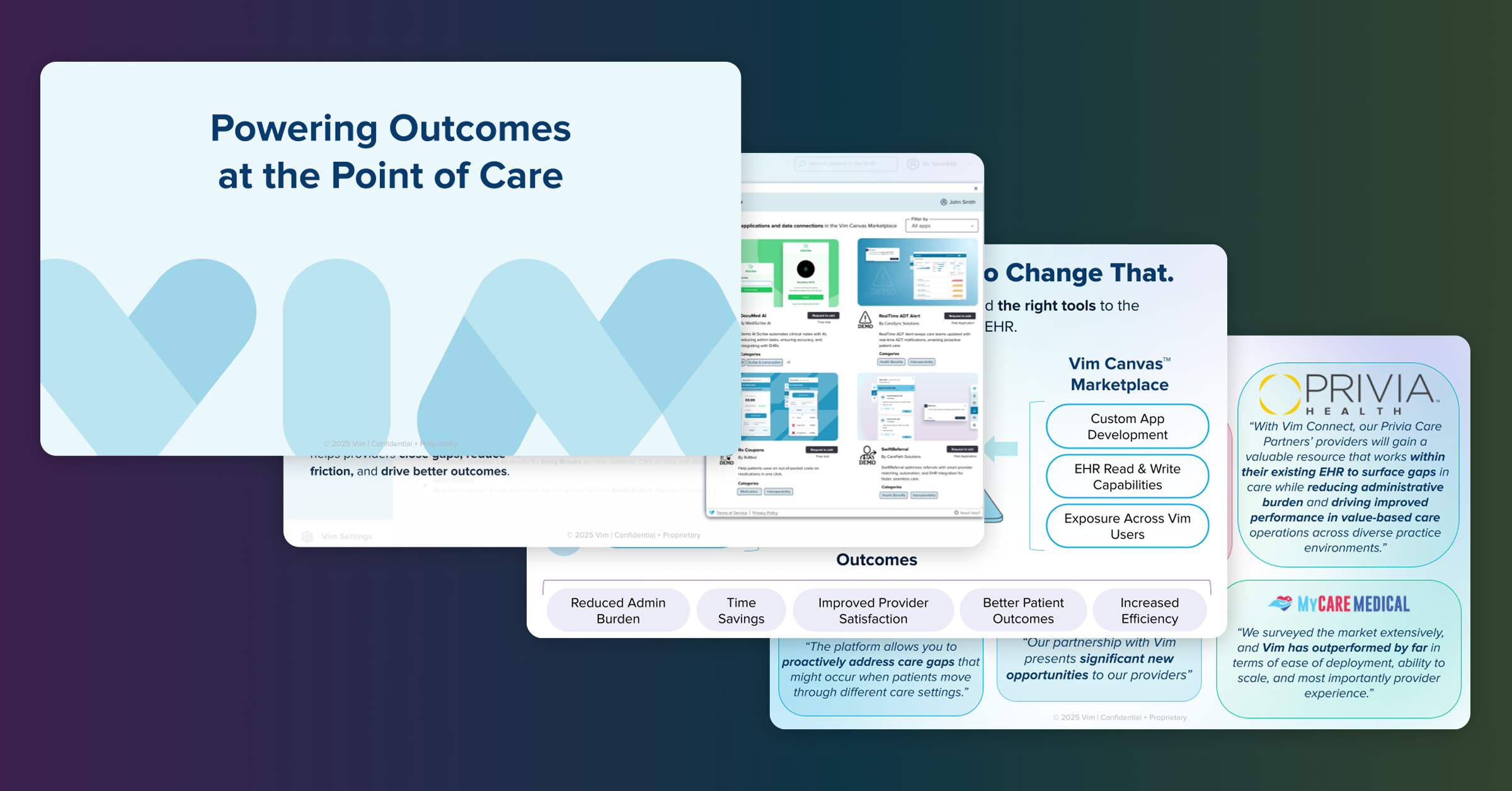 Access ready-to-use presentation decks designed to support sales, partner, and customer conversations. These materials ensure a consistent story across audiences while highlighting Vim’s value, products, and platform vision.